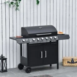 Outsunny Barbecue A Gas Con Coperchio, 7 Bruciatori Da 20kW, Fornello Laterale E 2 Ruote, 135x50x100cm Nero