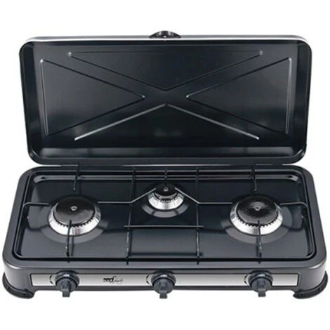 Fornello a gas 3 fuochi, base in alluminio con piedini in plastica, griglia removibile, regolazione della fiamma, funzionamento a gpl, solo per utilizzo esterno, colore nero