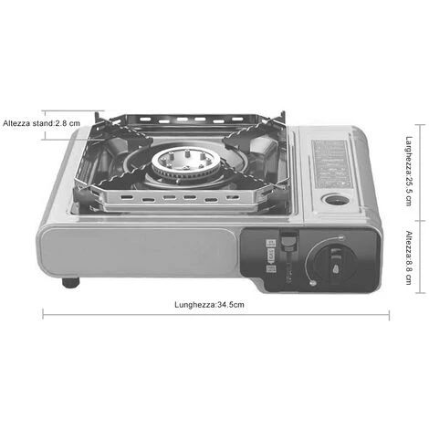 Presenta una leccarda con supporto, una manopola per il controllo del gas e una finestra di controllo della bomboletta.