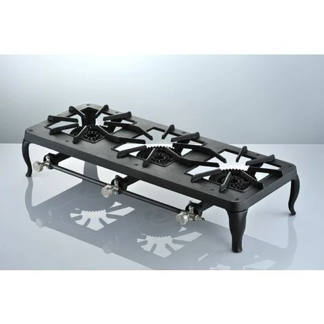 Fornello da campeggio tre fuochi portatile per GPL completamente in ghisa 81X30X16cm. Potenza sviluppata 12Kw.