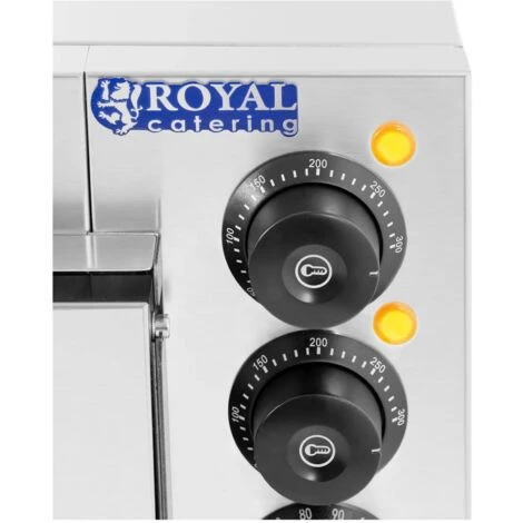 Il forno per pizza di Royal Catering è ideale per preparare pizze di ogni tipo in modo professionale. Il pratico dispositivo di cottura si presta all’utilizzo in pizzerie italiane, ma anche in bar, chioschi, snack bar o altri esercizi gastronomici che desiderano ampliare le loro attrezzature per la gastronomia. La precisa regolazione della temperatura con impostazione separata a riscaldamento superiore e inferiore, la professionale pietra per pizza in argilla refrattaria e l’affidabile timer permettono al pratico forno elettrico per pizza di offrire tutto ciò che è necessario per fare la pizza perfetta.