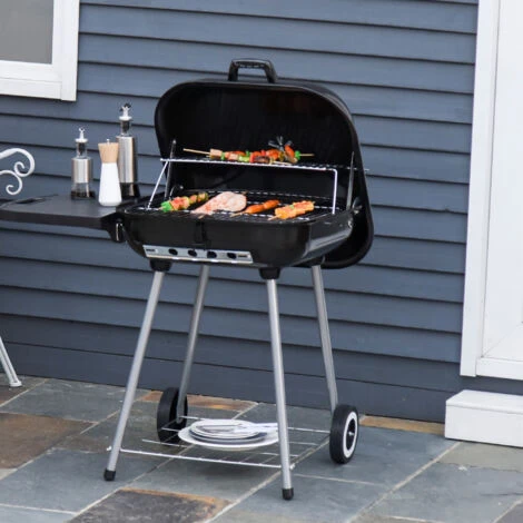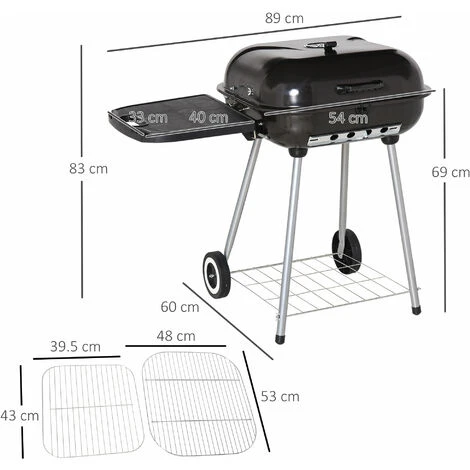 Barbecue Outsunny con struttura in porcellana resistente fino a 600°C, ideale per feste all’aperto. Coperchio con serratura per controllo flessibile del calore. La serranda in alluminio antiruggine e di facile regolazione consente la circolazione dell’aria senza sollevare il coperchio. La griglia di riscaldamento extra è ideale per mantenere caldi i cibi cotti. Impugnatura comoda per prevenire ustioni e facilitare apertura e chiusura. Il supporto sul fondo facilita la pulizia delle ceneri di carbone. Le 2 ruote e la maniglia laterale ti consentono di spostarlo con facilità. Ripiano pieghevole laterale per ulteriore spazio di stoccaggio. Richiede una semplice installazione