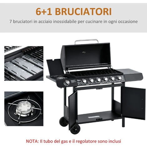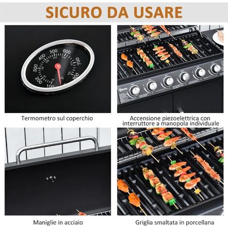 - • Costruzione robusta in metallo e acciaio, con griglia rivestita in ceramica e bruciatori in acciaio