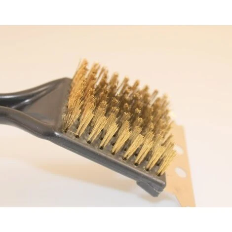 – SPAZZOLA A FILI DI OTTONE PER LA PULIZIA DI GRIGLIE IN ACCIAIO PER LA COTTURA SU FUOCO O BARBECUE,RASCHIETTO ANTERIORE PER ELIMINARE LE INCROSTAZIONI DA FIAMMA E CENERE.