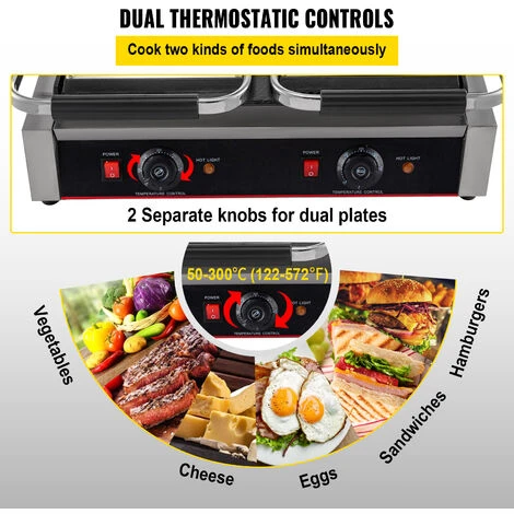 - 【TEMPERATURA REGOLABILE】 – La pressa a sandwich commerciale viene fornita con 2 manopole rotanti per un controllo separato preciso della temperatura. Con temperatura 50-300 ℃ (122-572 ℉) regolabile. Le luci a LED mostrano lo stato di riscaldamento.