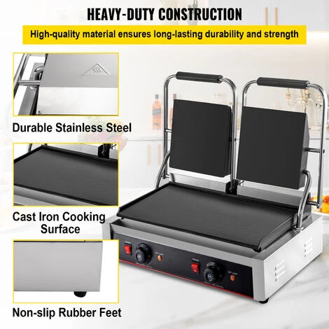 Questa pressa per panini in acciaio inox con rivestimento esterno in ghisa e vernice a smalto è perfetta per la cottura di vari alimenti, come panini, bistecche, carne, uova strapazzate, ecc. Le doppie piastre piane parallele facilitano il riscaldamento uniforme, senza capovolgere cibo. La temperatura è 50-300 ℃ (122-572 ℉) regolabile. È perfetto per uso commerciale!